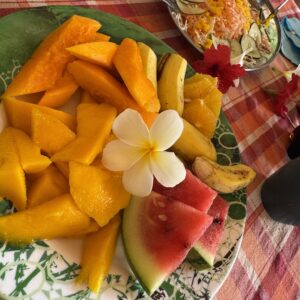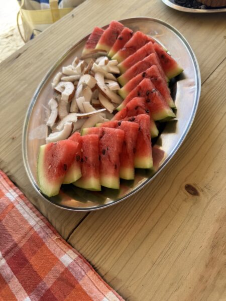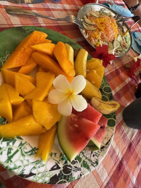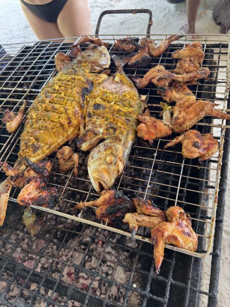 A barbecue ebédet a nyugati part közelében lévő, árnyékot adó tető alatt készítik el. A grillrácson hal, csirke és kolbász készül, amely mellé színpompás friss salátát kínálnak. Az ebédet követően a parton újra ejtőzhetünk vagy sétálhatunk egyet. Ezt követően a térdig érő vízből újra a csónakba szállnak a vendégek, amely visszaviszi őket a Simplicity hajóhoz.