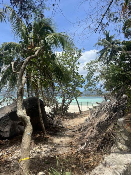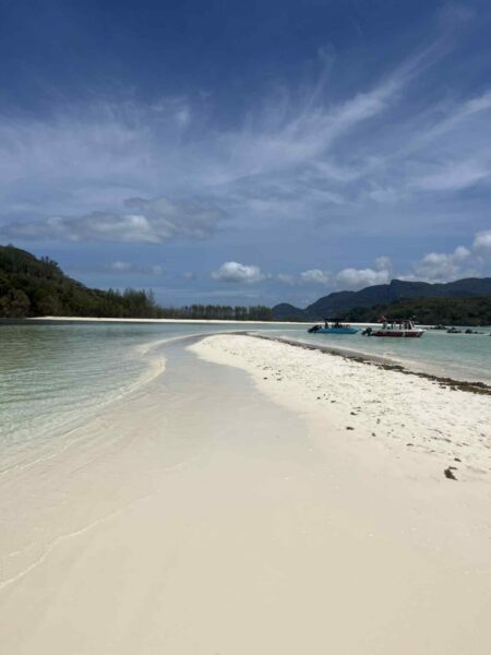 A sznorkelezést követően a Round és Long szigetek között található homokpadhoz megyünk, ami az áramlatok, az árapály változás, és a hullámzás miatt minden alkalommal kicsit más alakú. A tenger ezen a környéken nagyon sekély, ezért kisebb-nagyobb korallfejek és víz alatti sziklák között kell a kapitánynak navigálnia, hogy végül a vendégek a homokpad közvetlen közelében, térdig-bokáig érő vízben szállhassanak partra. Mivel a homokpad a Ste Anne Tengeri Nemzeti Park szinte kellős közepén található, a környező szigetek szinte mindegyikéről fantasztikus képek készíthetőek. A sekély víz és a fehér homok miatt az óceán színe káprázatos színekben mutatkozik.